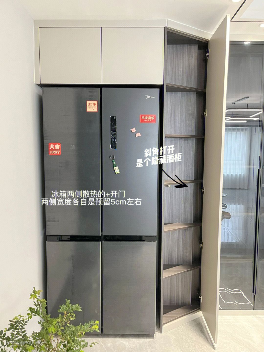 最左侧是冰箱柜,为了更好的内嵌冰箱,做了一个斜角设计,既可以让整体不显突兀,更加美观,斜角处做成隐藏酒柜也是别有一番特色。