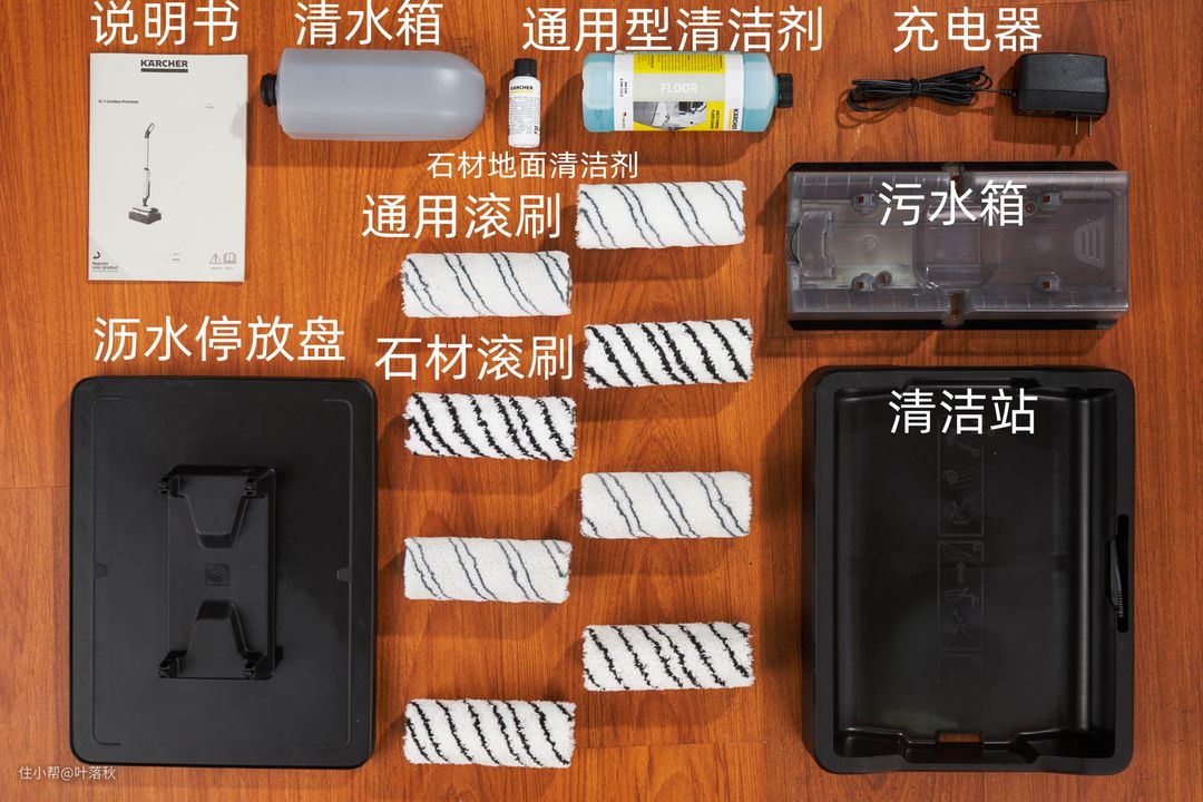 说明书、充电器、清水箱、污水箱、清洁剂(通用型+石材地面型)、沥水停放盘+清洁站,通用滚刷*4、石材滚刷*4。