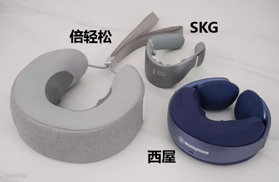 倍轻松体积更大,跟U型枕差不多。SKG体积更小,虽然摆在桌面上看外形有点怪异,但实际上戴着蛮时尚。