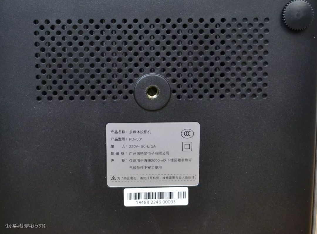 这款投影仪在底部采用了可调式的可旋转支架,放在桌子上可以旋转可调节投射的画面的高度,中间吊装的螺丝孔,用户可根据自己的使用场景来调整投影仪的俯仰角,实现画面的上下移动,因为也支持梯形校正,上下俯仰角30度,都能投出方正的画面。