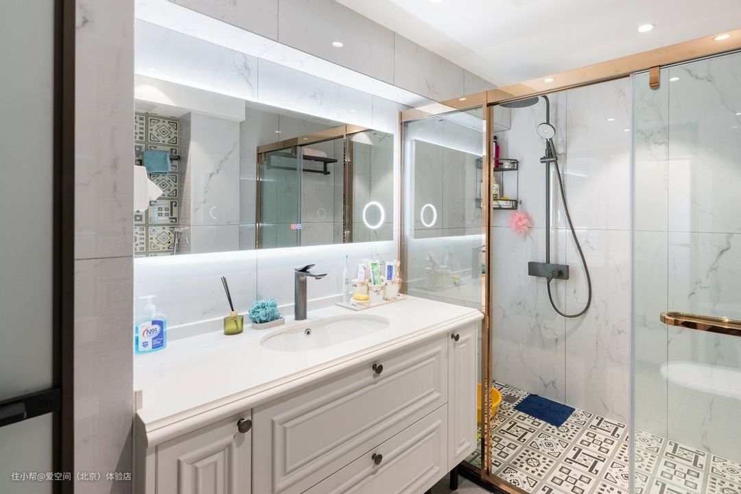 浴室柜采用欧派品牌。浴室柜拥有超宽敞镜柜,满墙镜柜最大的好处就是,浴室的空间更显开阔,充足的收纳空间,再多的囤货都能统统放进去,视觉上镜子里多了一个大空间,使人有视觉差,显得卫生间空间更大、更宽敞明亮。
