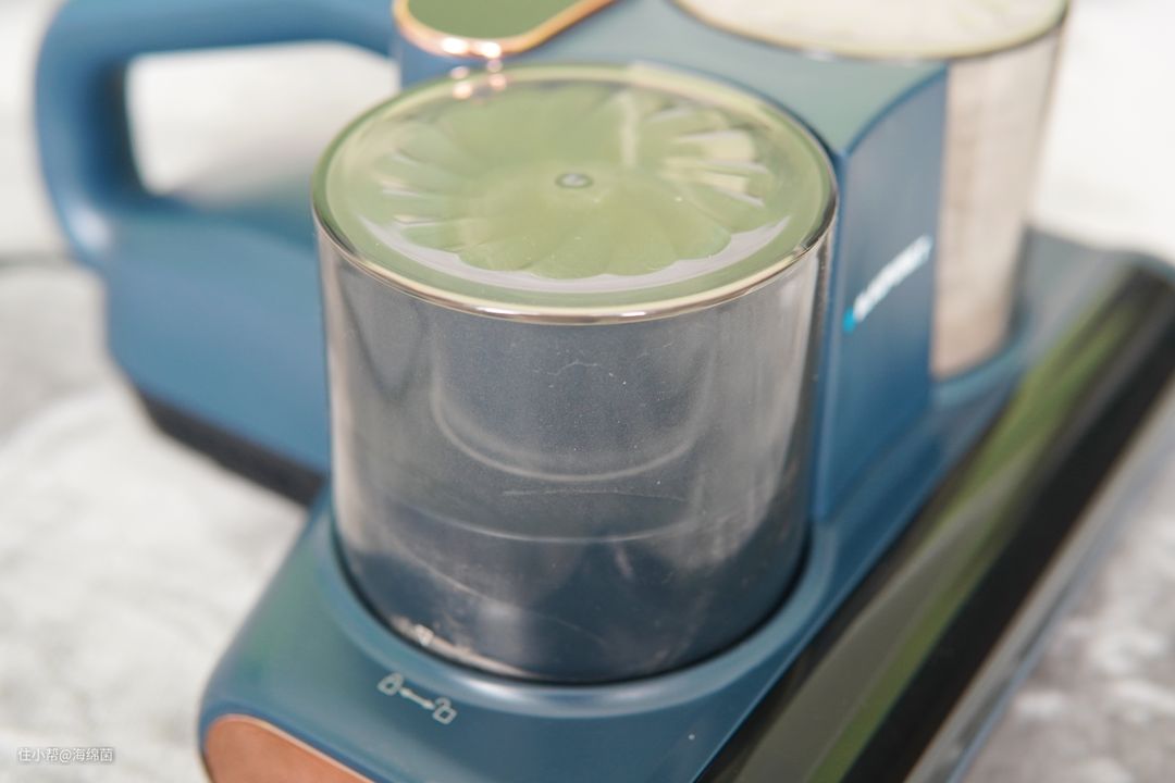 真双杯设计应该是这款除螨仪最大的亮点了,可以看到吸头上方左右两侧各有一个杯体,图中左侧是过滤杯,右侧是集尘杯。