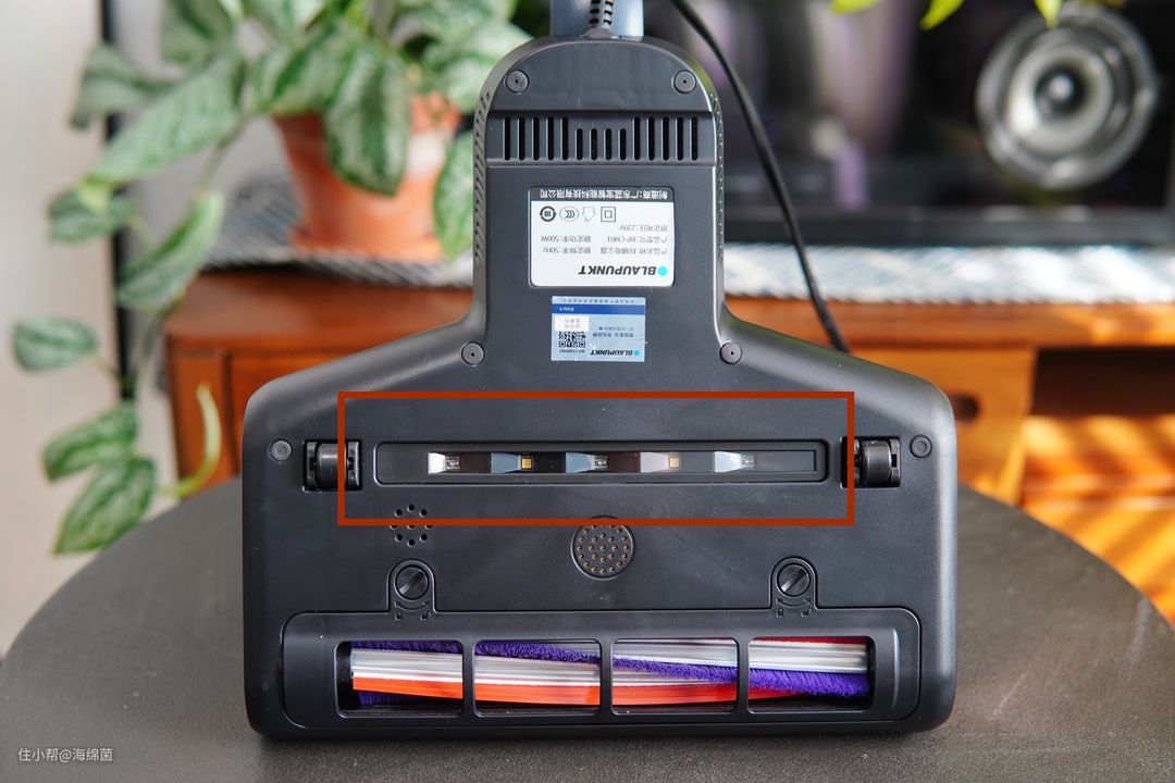 除了大吸力和高频拍打之外,机器在除螨上还做了一些其他的努力,比如下图红色方框内就是UVC紫外灯,LED灯珠会释放紫外光,穿透和破坏螨虫和细菌的DNA起到进一步杀灭的效果。紫外线杀菌其实算是比较常见的杀菌手段,在很多地方都有应用,结合到除螨仪上确实会有锦上添花的效果。