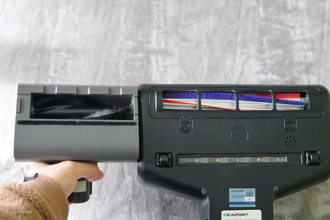 除螨仪的刷头由拍打滚刷和柔性滚刷组合而成,粗看很像是吸尘器的滚刷设计,但其实是为除尘螨特殊设计的。