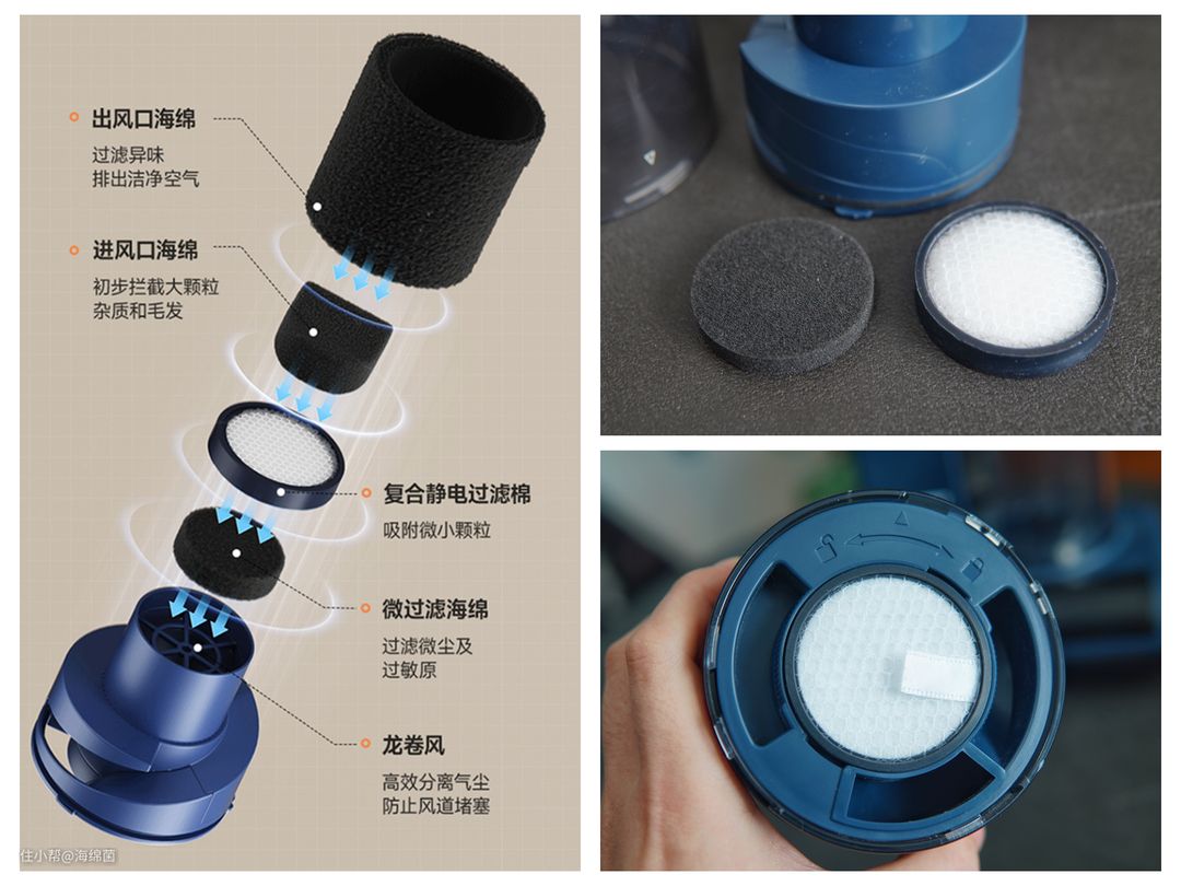 过滤系统决定了除螨仪排出的空气是否足够洁净,如果这一块做得不够好,那吸进除螨仪里的灰尘就容易随着排气重新进入到空气中,这对我们的呼吸道和健康都是一种隐患。蓝宝除螨仪采用了五重拦截设计的过滤系统,高效的尘气分离已经把绝大部分的粉尘转移到了尘杯中,再加上微过滤海绵,复合静电过滤棉,进风口和出风口海绵的协同拦截,就能达到H10等级的过滤效果,从而保证灰尘螨虫等等不会被释放到空气中,造成二次污染。