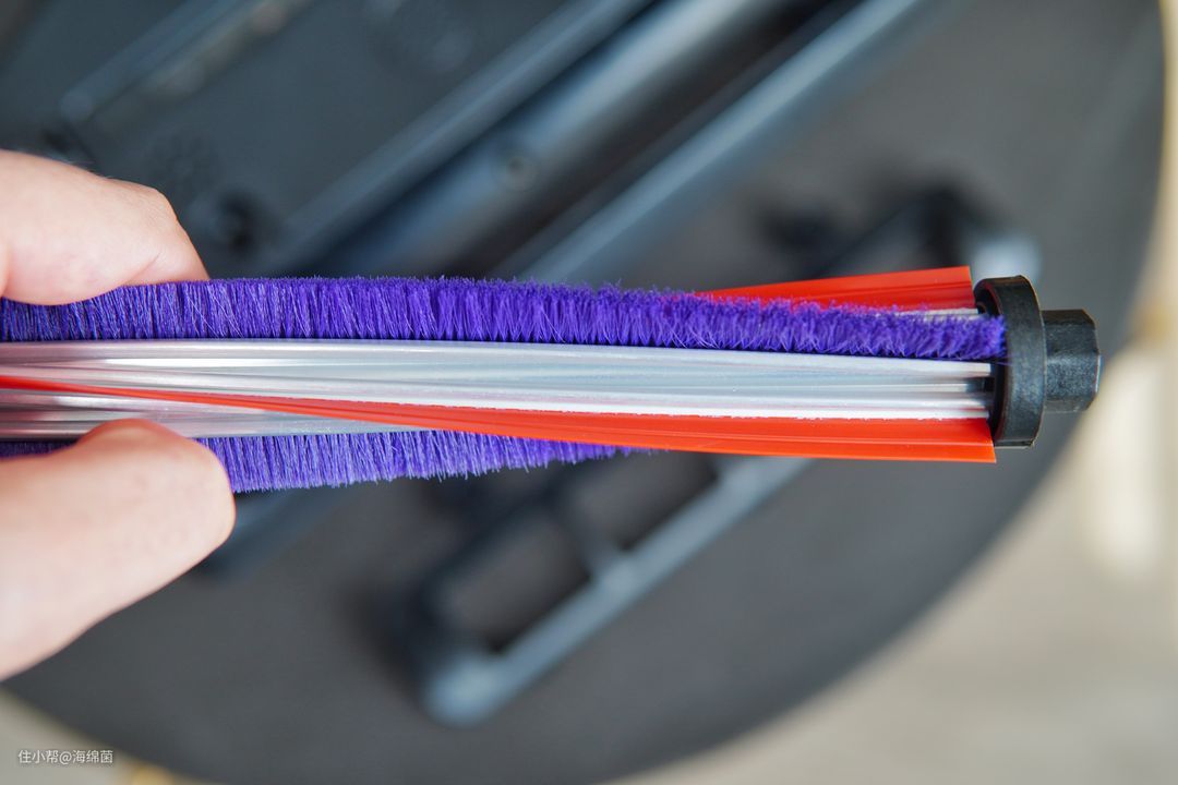 紫色的部分则是电动柔性滚刷,柔软又有弹性的纤维毛能深入织物的缝隙,将藏在里面的灰尘和螨虫清扫出来,紧贴织物表面的刷毛还能挑开螨虫足部的倒钩,进一步提高除螨效率。