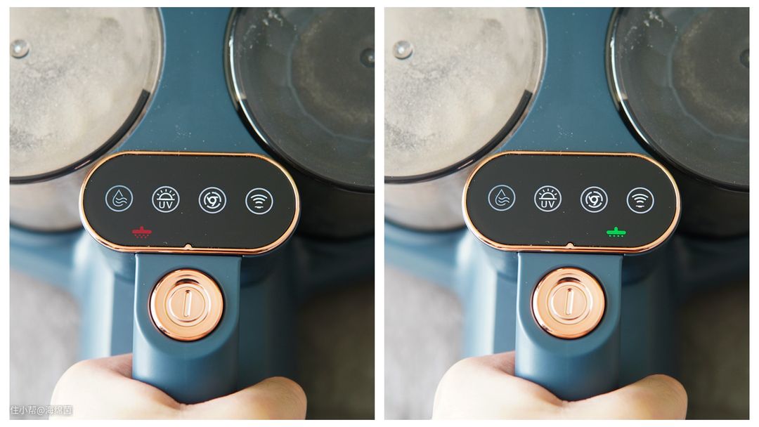 下图中红色感应灯亮起表示还有尘螨残留,需要继续清洁,绿色灯亮起则代表这里清洁干净了,我们就可以继续转战他处了。虽然感觉是一个不起眼的小设计,但对于使用体验上的提升却是巨大的。