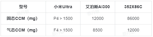 而艾泊斯AI300和352X86C的客服则给出了更精准的数值,其中固态CCM最高的为352X86C,达到86000mg,气态CCM最高的也是352X86C,达到12000mg。