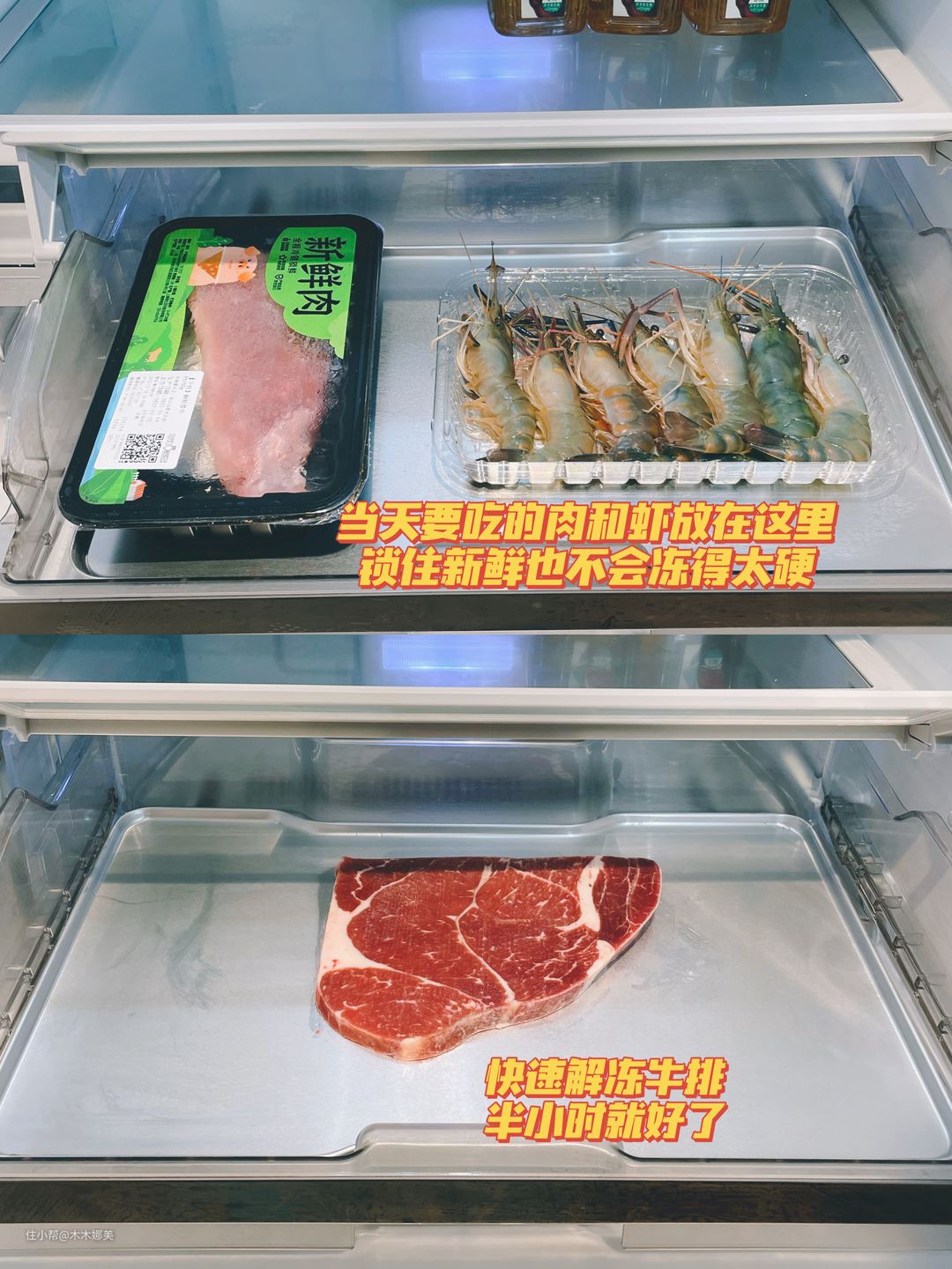 我可太喜欢它的星级料理舱了,买的肉如果当天要吃,放这里就行,不会冻得很硬又能保持新鲜口感。下班回来想吃个牛排,也不用放在水里泡了,在这里半小时就解冻好了很方便。