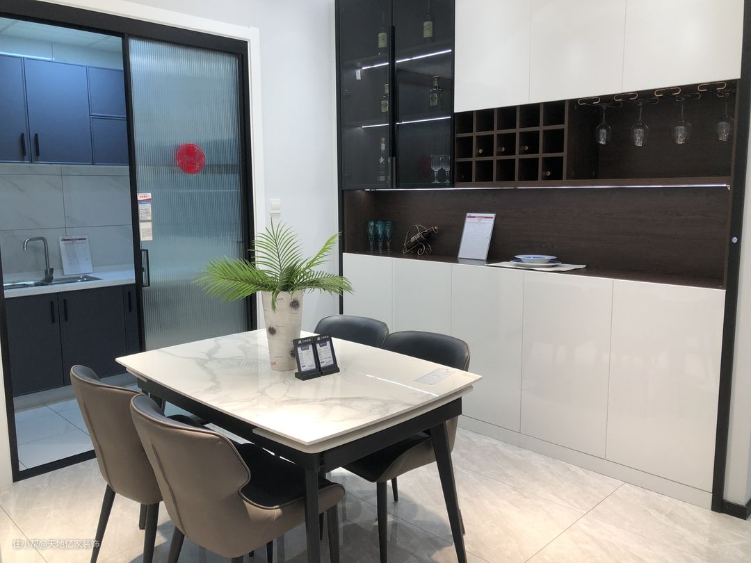 餐厅整体,采用黑色和白色两种搭配,带来视觉上的冲击,彰显出空间感。大理石纹路的餐桌面,不仅时尚,而且容易清洁,美观实用。搭配上拼接色的餐椅,质感十足,坐感舒适,易打理。壁橱分区域设计,兼顾实用性,考虑到不同的收纳需求,让收纳变的更加整齐有序。