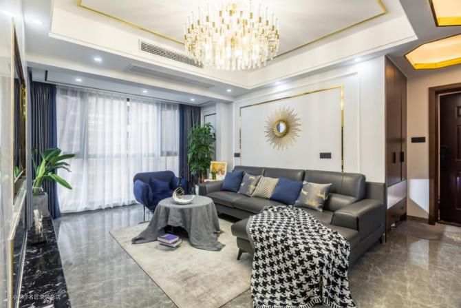 客厅以白、灰色为主,落地窗以白窗纱打底,圆形的茶几搭配灰色桌布、白色绒面地毯,以及墙面上的金属线条,轻奢而现代、宽敞而明亮。