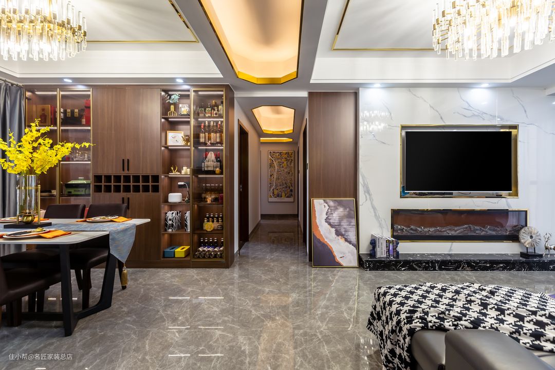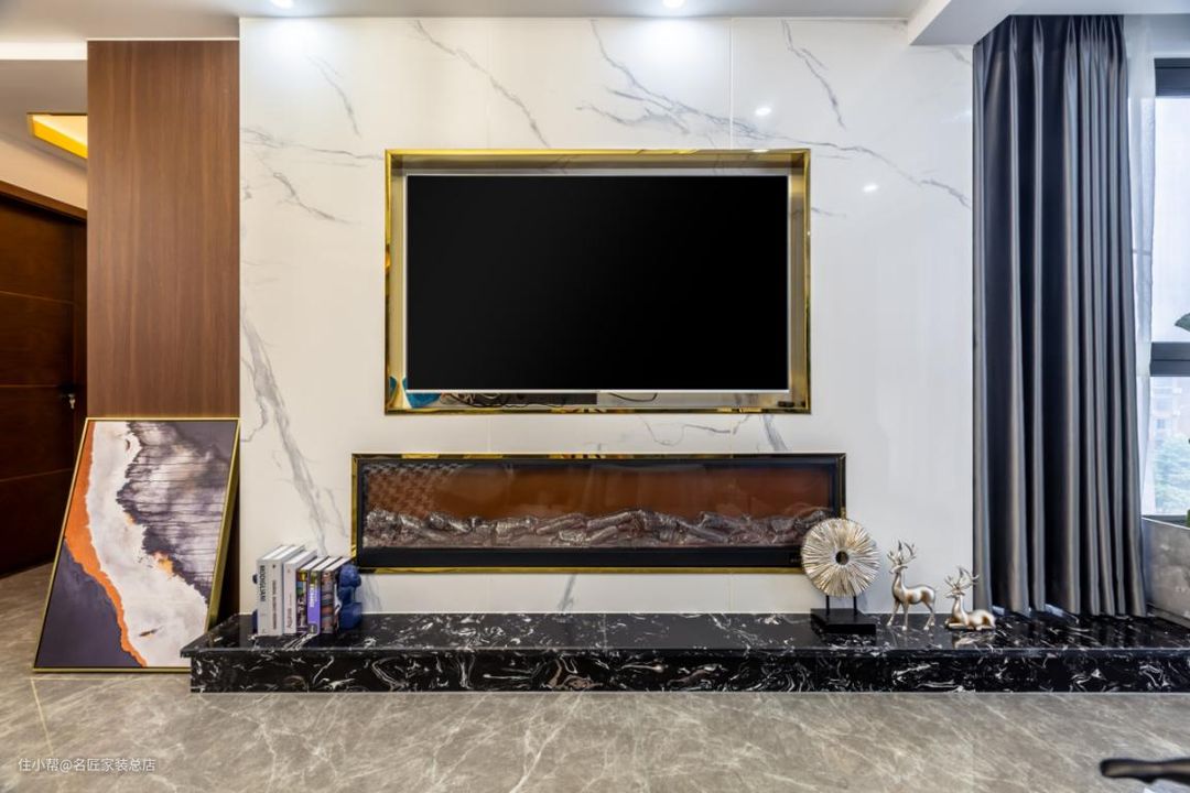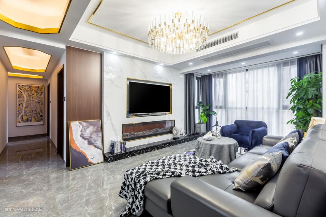 客厅特地选了灰色皮质沙发,可以和灰色大理石瓷砖地面相呼应。电视镶嵌在背景墙中,与装饰壁炉居中搭配,右下角台面上摆放艺术性强的银色装饰,艺术感满满。