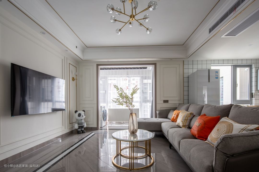 电视背景墙几乎没有过多装饰,整个画面只用金属线条和石膏线条勾勒出层次结构,空间极具简约和立体感。同时电视两边设计了金属壁挂灯小细节,与墙面的金属线条相呼应,营造出一丝轻奢时尚的味道,右边墙角的熊猫摆件生动地融入进来。#电视背景墙