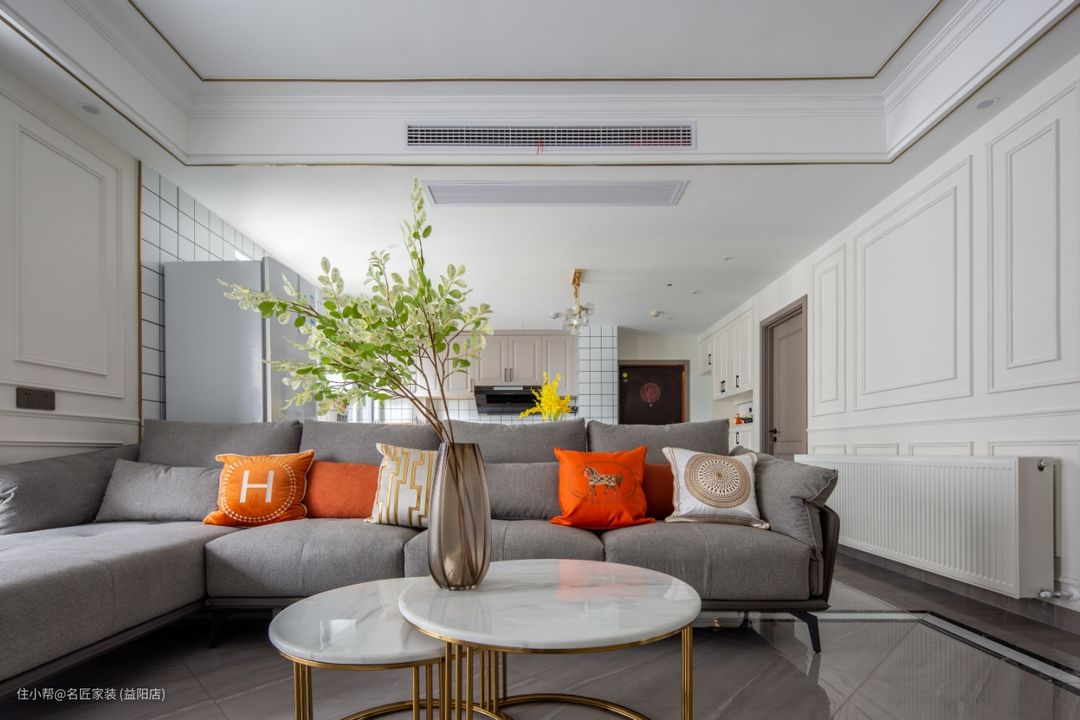 餐厨区客厅不做隔断,L型的长沙发就是最好看简约的隔断。客厅与餐厨区域选择灰色大理石的通铺,保证空间的统一协调。沙发的颜色也选择了浅灰色的布艺沙发,与周围整体环境相融合,几个橙色的抱枕成为唯一的跳色,在浅色系的空间中增添活泼可爱。#客厅#沙发
