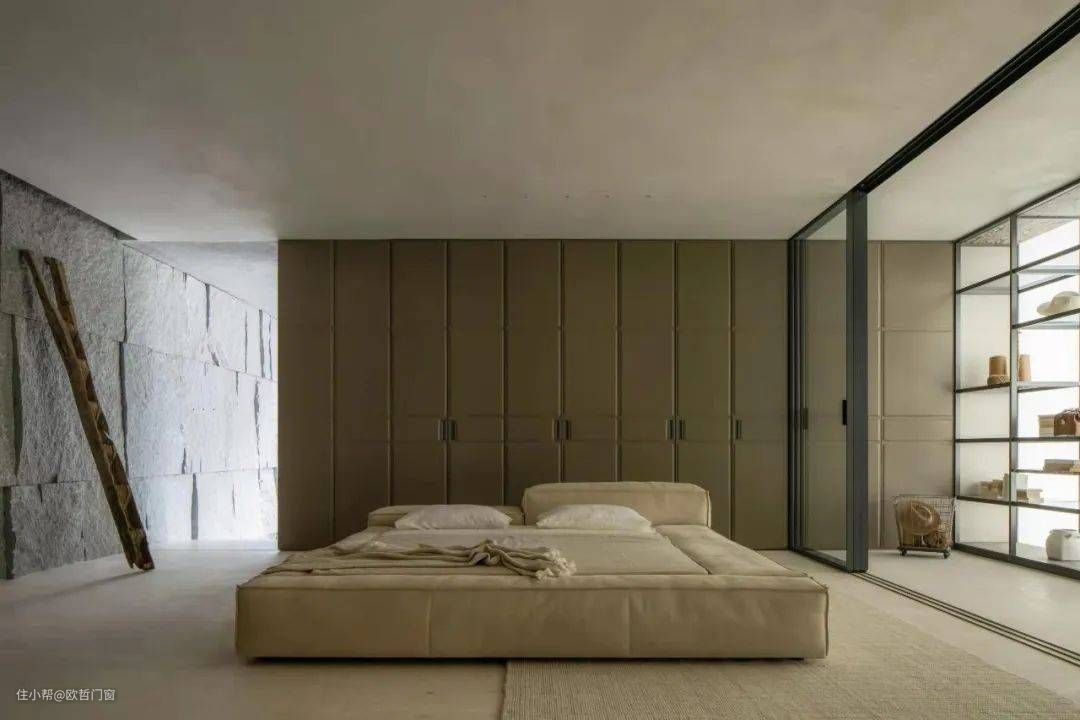 主卧空间选用的是「自由边界室内极窄推拉门」,这是欧哲极窄设计代表之作,勾企可视面仅30mm,无限延伸视觉,形成一个隔而不绝的独立空间,消弭了实有的空间隔阂及边界感。