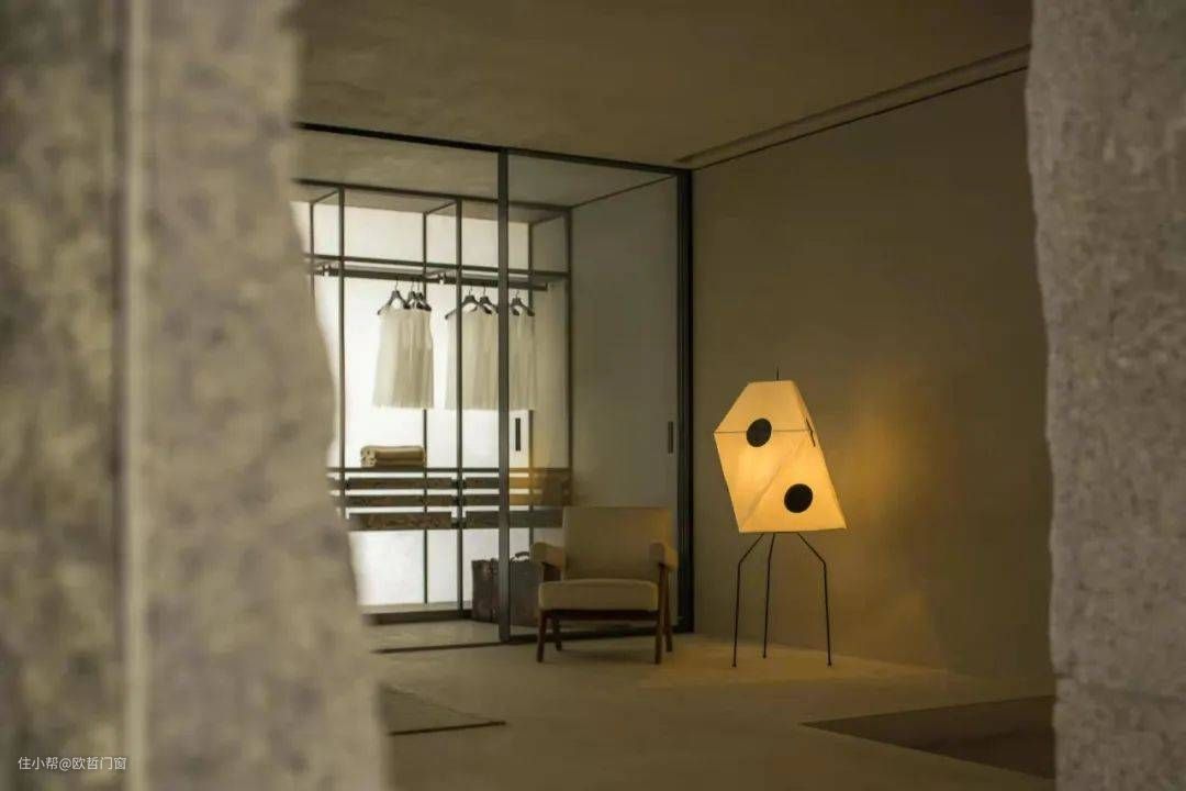 更特别的是,设计师大胆选用欧哲「自由边界室内极窄推拉门」作为衣帽间门。以极简设计的玻璃门,打通原本密闭的空间,既防尘又通透,实用性和美观性兼具。同时,让衣帽间内的层次感得以呈现,提升生活场景的质感。
