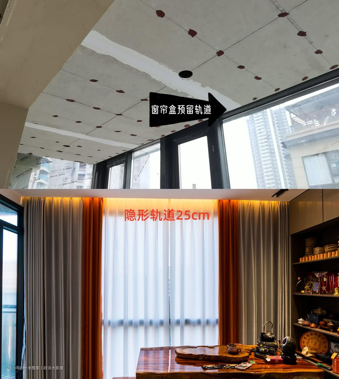 如果是阳台窗帘则需预留25cm,方便安装电机。如需预埋隐形轨道,则需预留18.5cm。
