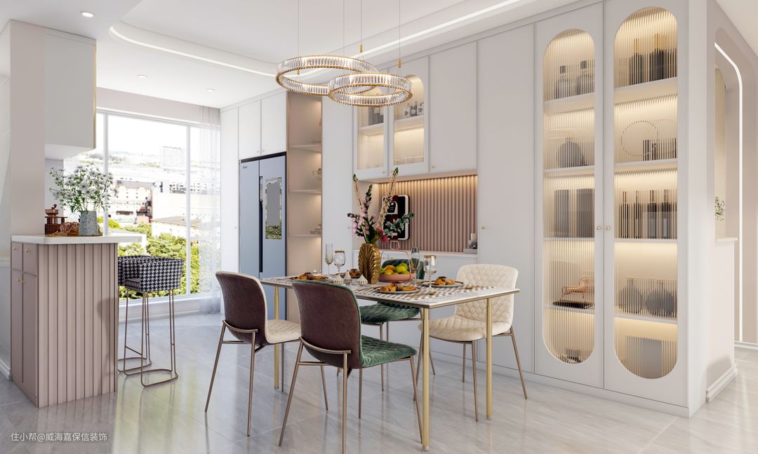餐椅的颜色也是和沙发呼应,餐厅与客厅吊灯的独特造型提升格调的同时,还能透过光源让空间的整体色调自然融合,为日常生活营造出浪漫的居家氛围。