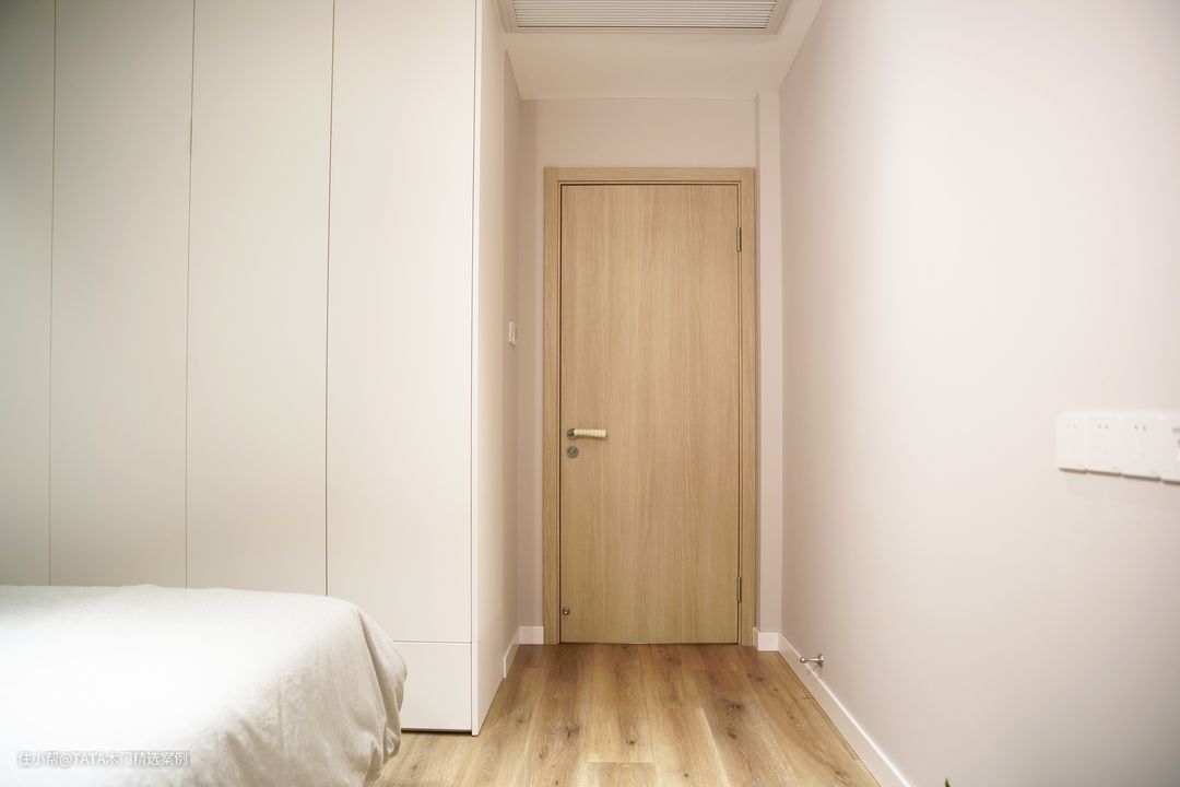 - 卧室:卧室房门颜色材质也选用与墙板一致的同质同色的米橡色。这样让空间看起来错落有致的同时,也会更统一。记得踢脚线、门套‘’窗套也用原木色哦。