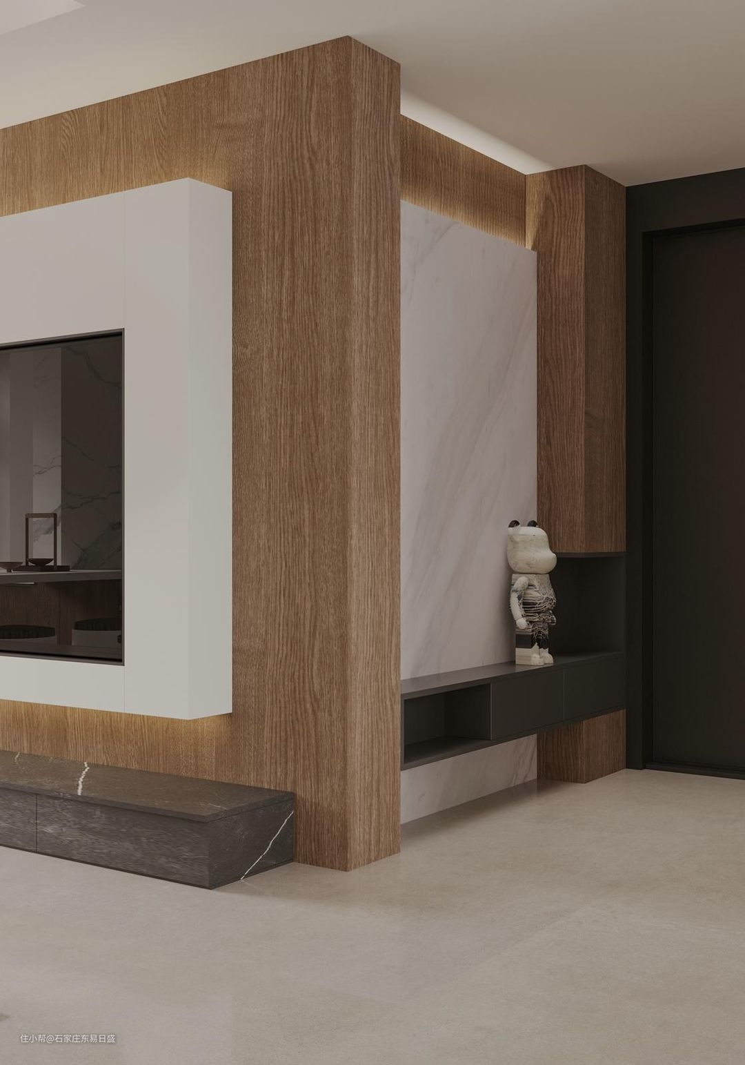 入户右手边有纹理的大理石与木板搭配,中下方做悬空柜面,底部可以摆放鞋子,柜面上摆放的暴力熊摆件,提升整体的氛围感,一进家就让人眼前一亮。
