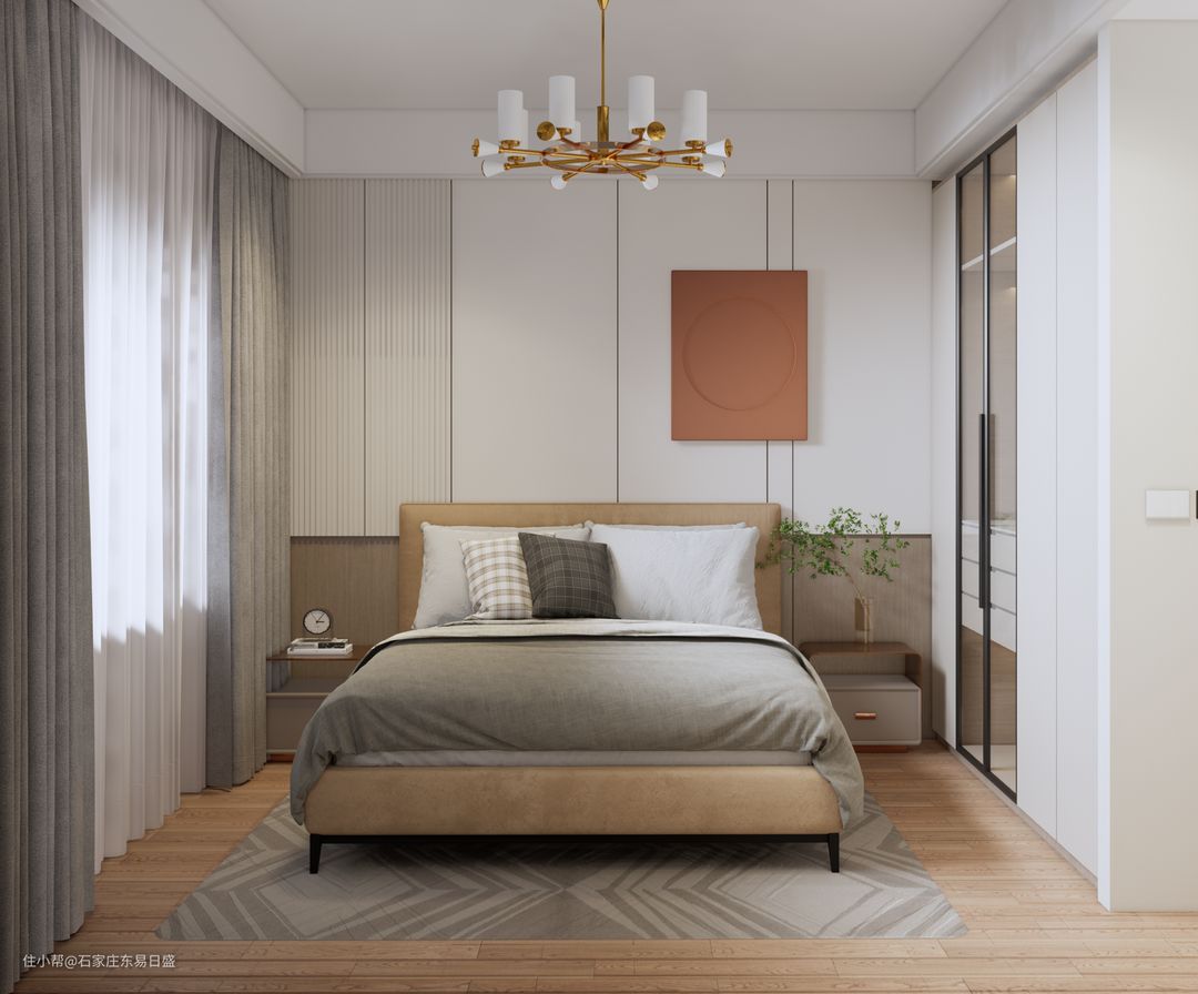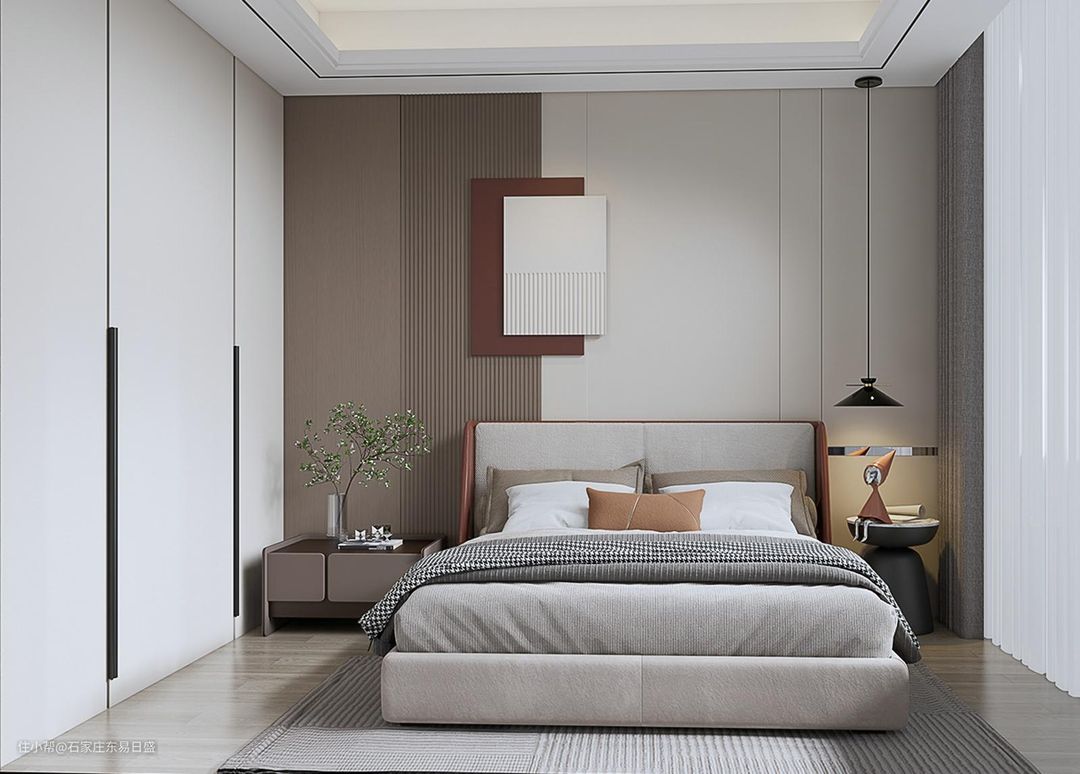 床头背景墙采用左右拼接的方式,再用装饰画点缀,让空间看起来简约有层次感。右侧黑色极简小吊灯,丰富空间线条的同时,营造了舒适柔和的氛围。