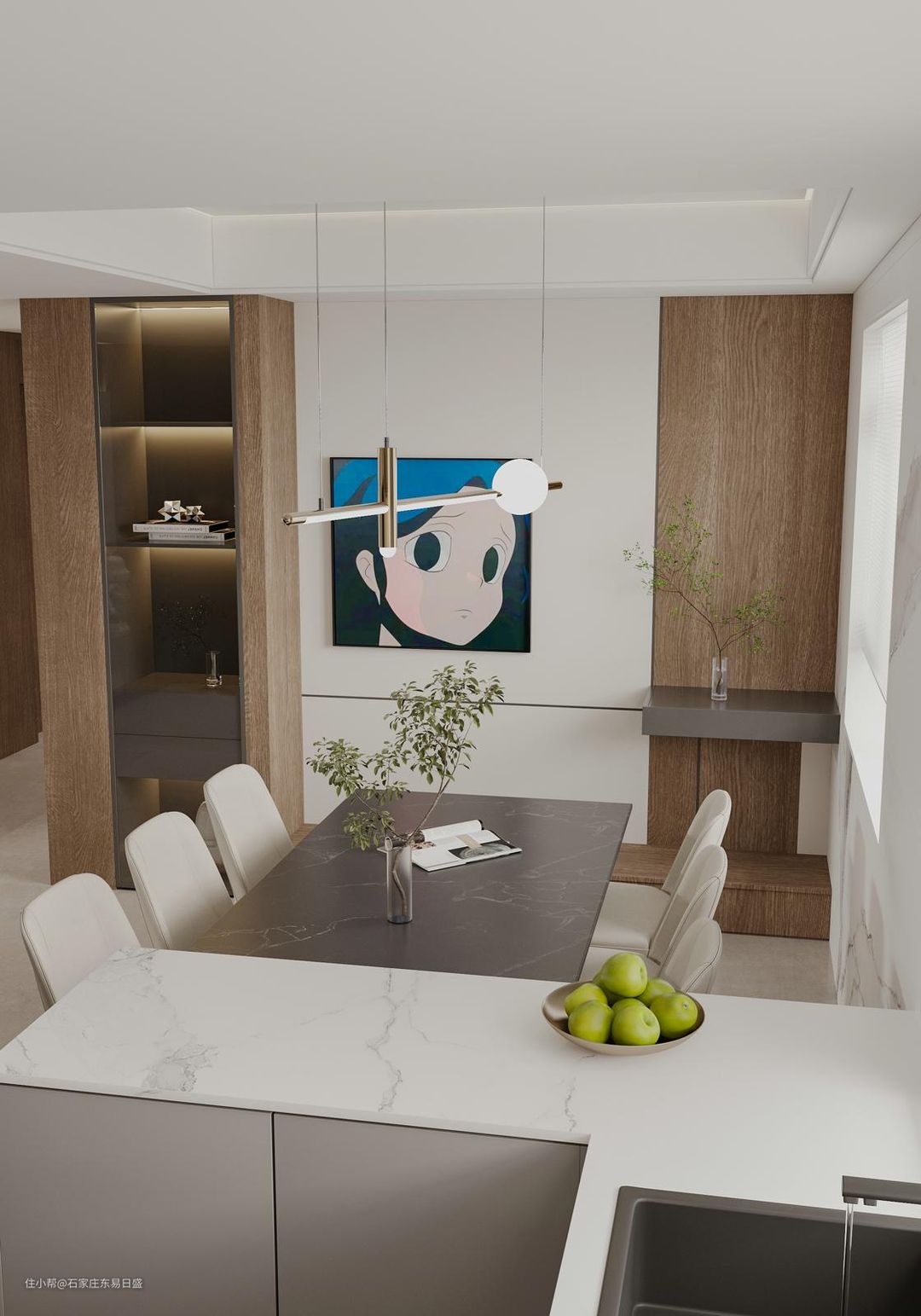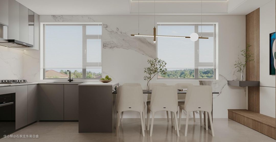 现代化的餐椅餐桌虽然没有过多繁琐的元素装饰,用一颗绿植点缀,却能够营造出一种大方舒适的空间氛围感。同时开放式的厨房和餐厅加强了互动。