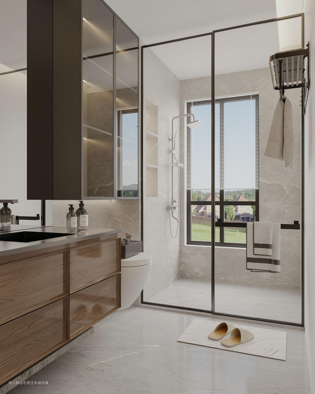 卫生间用黑框玻璃门做干湿分离设计,淋浴时不用担心把水渍溅到干区,可以保证干区干燥洁净。淋浴区砌墙做壁龛,洗浴用品好拿放。洗漱台悬空的设计让卫生无死角。