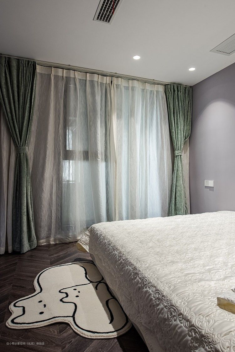 卧室通刷柔和内敛的浅灰紫色乳胶漆,是一个灰度比较高的浅紫色,也是莫兰迪色系里的经典颜色,保留浪漫温柔的同时,又比粉色少一分甜腻,多了一分质感,放在家装中更显耐看,搭配白色床品,勾勒出柔和宁静、舒缓雅致的美感。