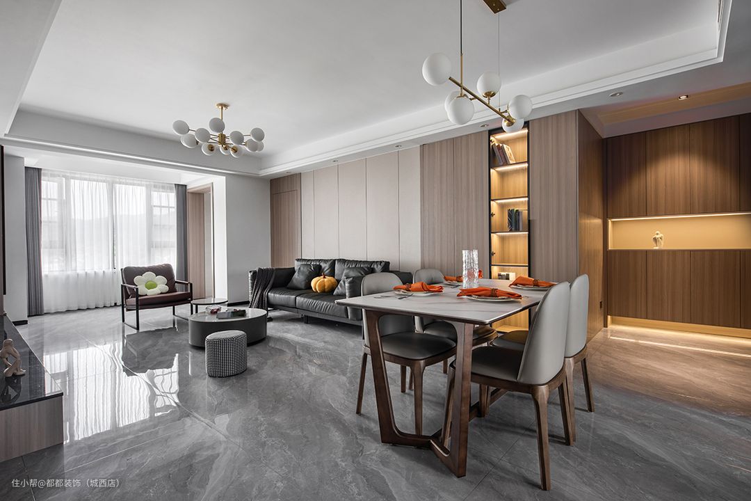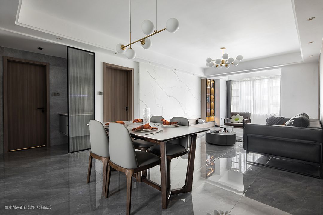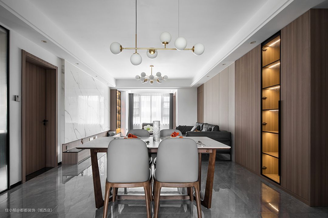 餐厅设置在客厅和厨房之间,是标准的大横厅布局,餐桌上方的吊灯和客厅的主灯相呼应,做到了融会贯通的效果