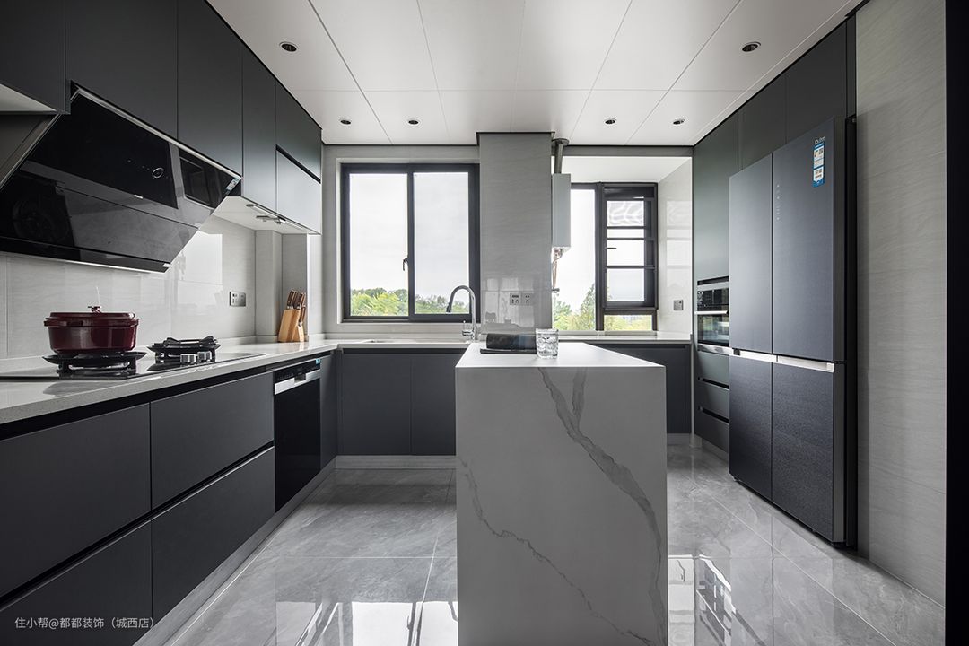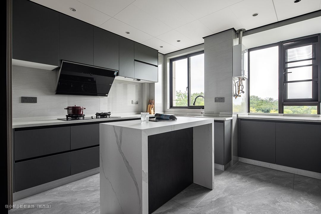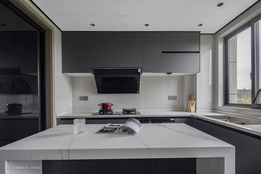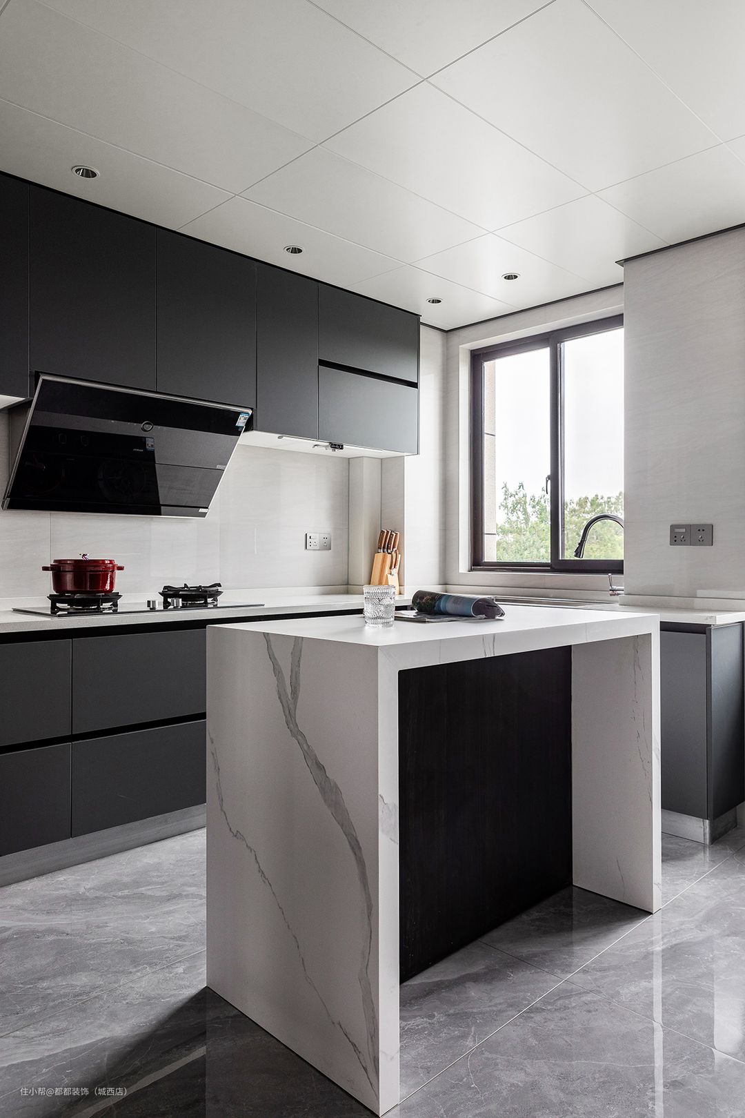 中岛台面以大理石制成,满足了谢总喜爱的自然纹路,和厨房整体灰色调很搭