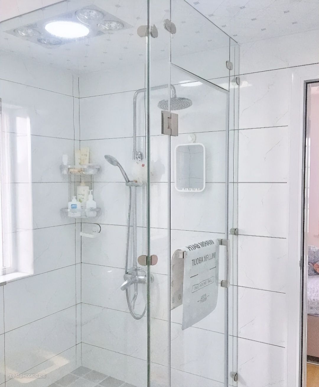 2、正方形淋浴房,比较适合面积较大的卫生间,它是用两块玻璃与墙体合围,形成一个方正的淋浴房。