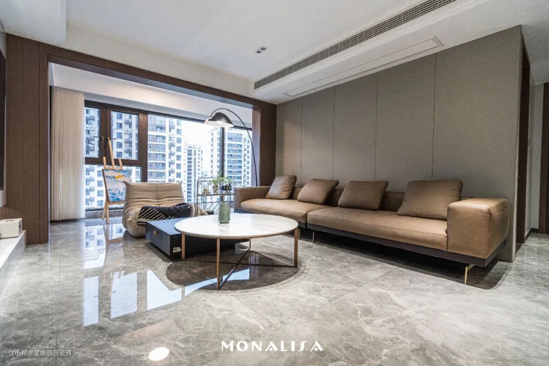 家的高级感从一进门就开始了,屋主用1200*2400mm规格的陶瓷大板连纹背景墙,一板到顶,延续至客厅沙发背景墙,搭配咖色、灰调的木饰面加强层次感。而地面的啡调的陶瓷大板奥斯汀啡也形成呼应。光影交错间,家被赋予了美好的意义。
