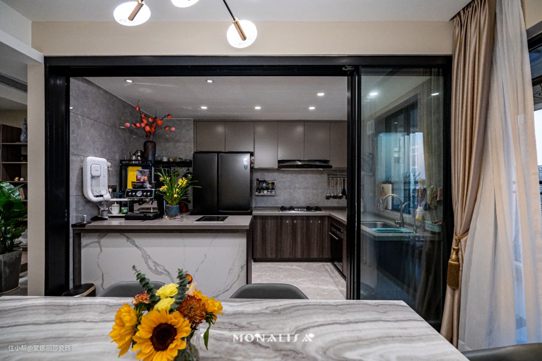 屋主将900*1800mm规格的维纳斯灰作为客厅/餐厅/阳台的主砖,热爱旅游的shally更希望家里的风格能偏向于酒店风,简约干净,凸显出艺术性和设计感。做了开放式的厨房,与餐厅联通,深灰色橱柜与罗马超石代系列的3.6米陶瓷大板组合,大气又精致。