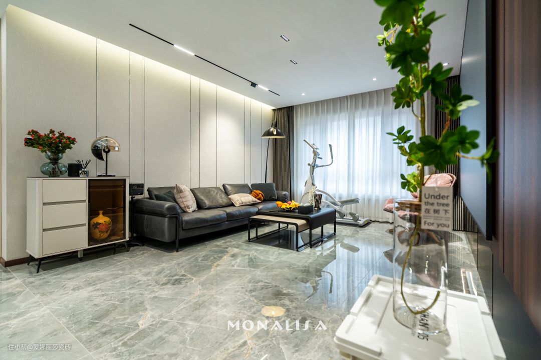 屋主伊恩呐很注重美与仪式感,整屋以中性色为基调,只为凸显简单而纯粹的空间感。电视背景墙选用1200*2400mm规格的新爵士白陶瓷大板,优雅的大理石花纹融于空间呈现出不俗的艺术感。