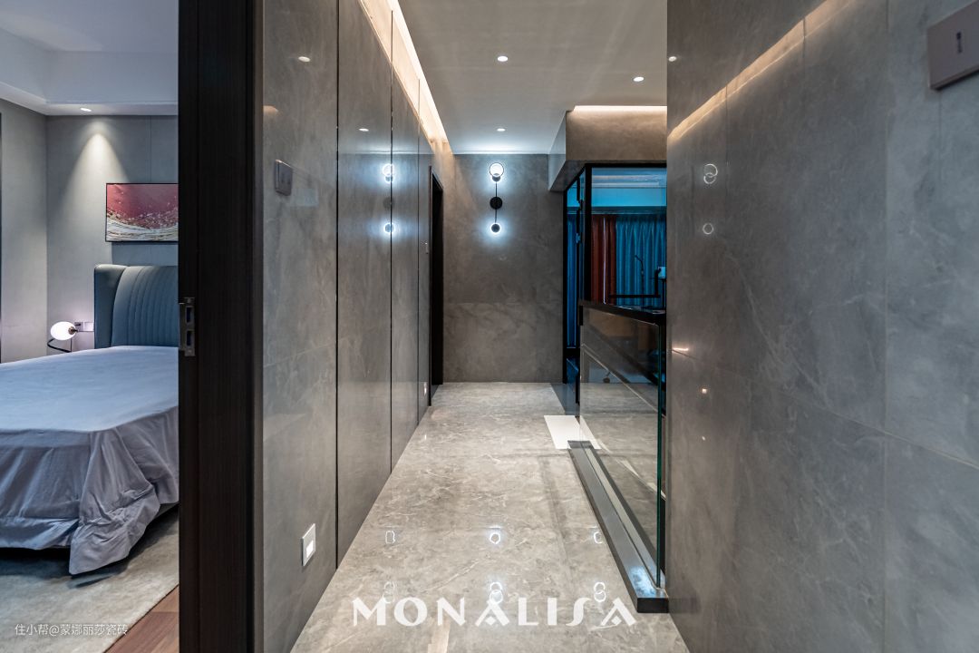屋主小伊喜欢极简的生活态度,将有限的精力花在刀刃上。作为资深化妆师,对材料、色彩的选择追求极致,多方对比后选用了陶瓷薄板系列应用在全屋范围。上墙下地,用厚度仅5.5mm的爵士灰、意大利浅灰、美感白切割后拼接铺贴在墙面,装饰出和谐有层次感的视觉效果,让空间更简洁时尚。