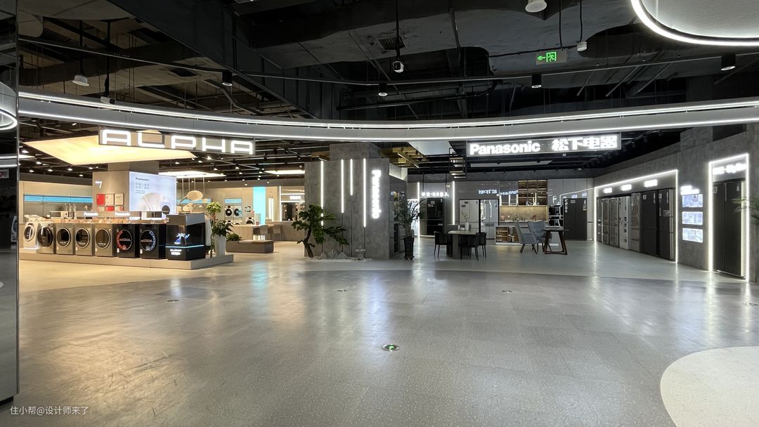 Panasonic松下区域与ALPHA洗衣机展陈区,所有的展陈形式、材质、光照等,都在围绕都市生活中精英的“双面人设”来布局,既可以朴素自然,又可以奢华冷静;拥有身临其境般的家居体验空间,开放式视觉延伸。整体以原木纹、暖色肌理漆、大面积不锈钢、哑光金属板等材质,营造出温暖、时尚、活力的家居空间。灯光和材质的合理运用突显产品的轻奢高级,正上方是一个大型的电子屏幕,用一些动画为我们展现松下洗护自带的专利,不同衣物的清洁养护方案,既能吸引来往的顾客进店了解,又能促销产品成单!