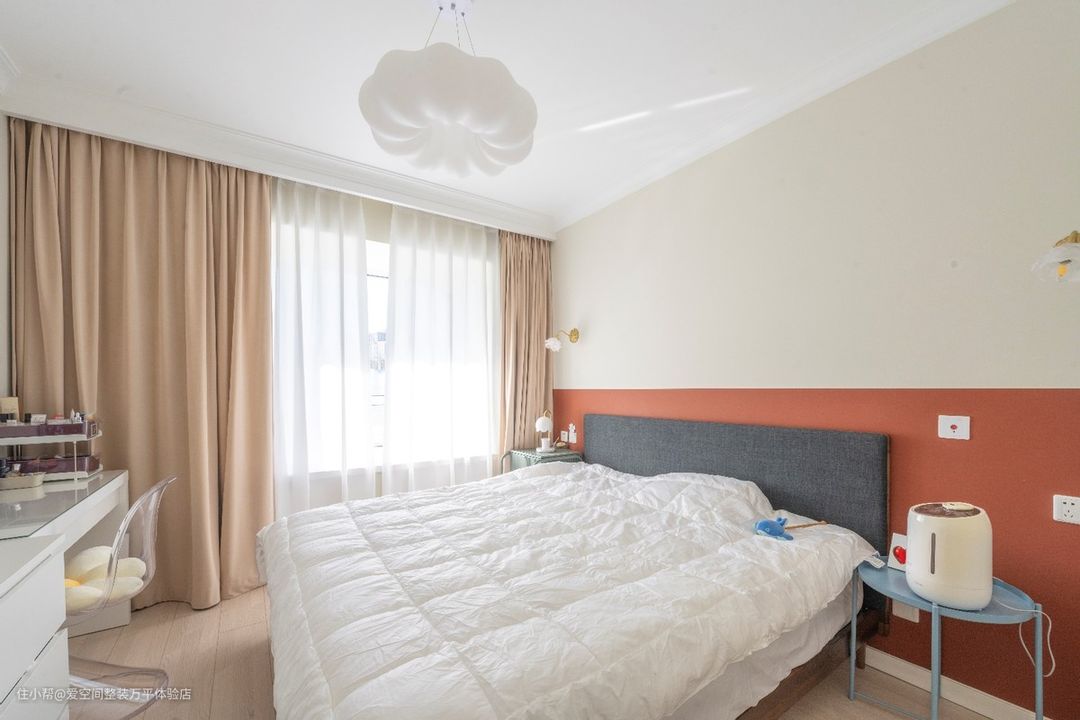 乳胶漆采用来威品牌。卧室整体呈现一种简约随性慵懒,又不失浪漫的法式风格,温婉、优雅,复古又精致,无论从搭配、选材到色调,都透着满满的质感,极简的设计,小众又高级。床头背景墙做拼色设计,空间色彩和层次更加丰富。