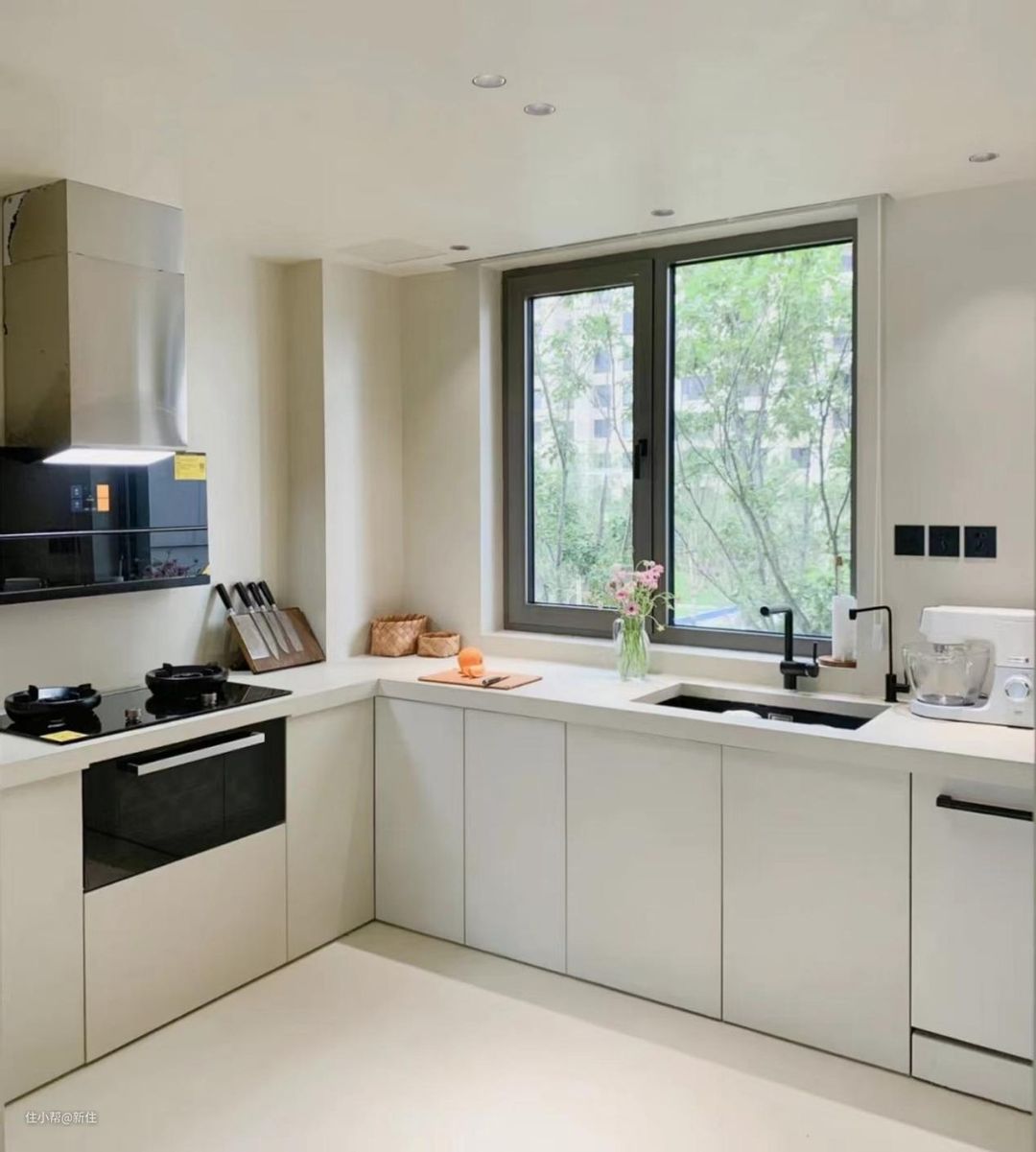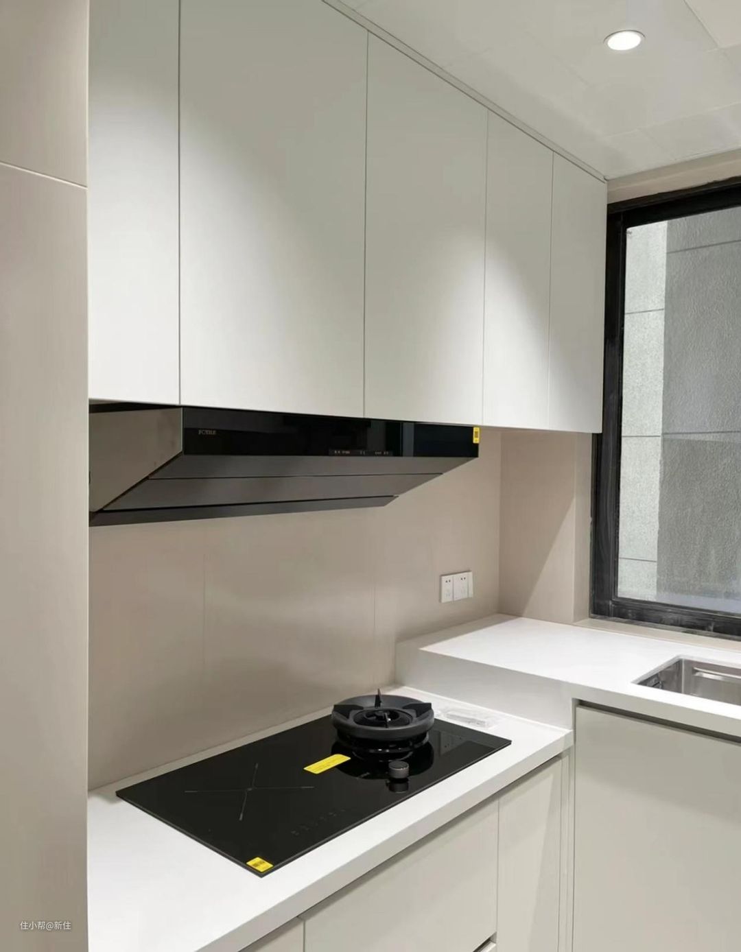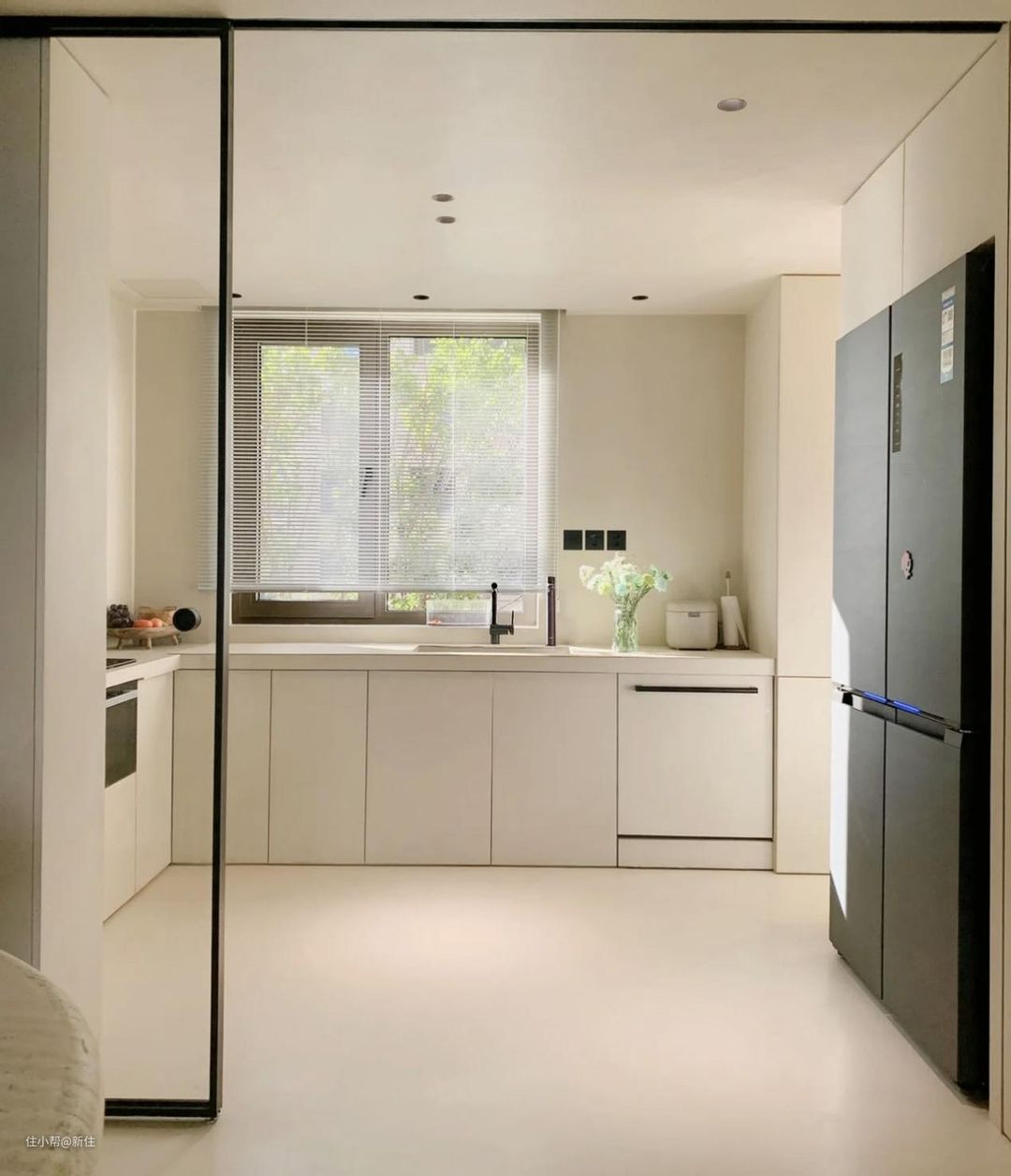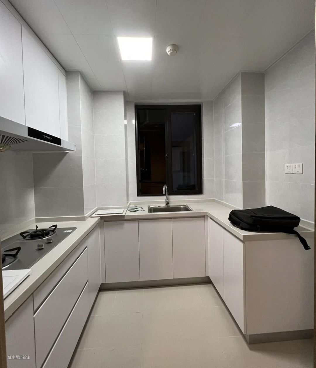 理论上,厨房用高光门板、亮光砖等会更好打理,但同时也得面临一个实际的问题,做无主灯会有光污染,灯会映衬在门板、瓷砖上,显得乱七八糟。