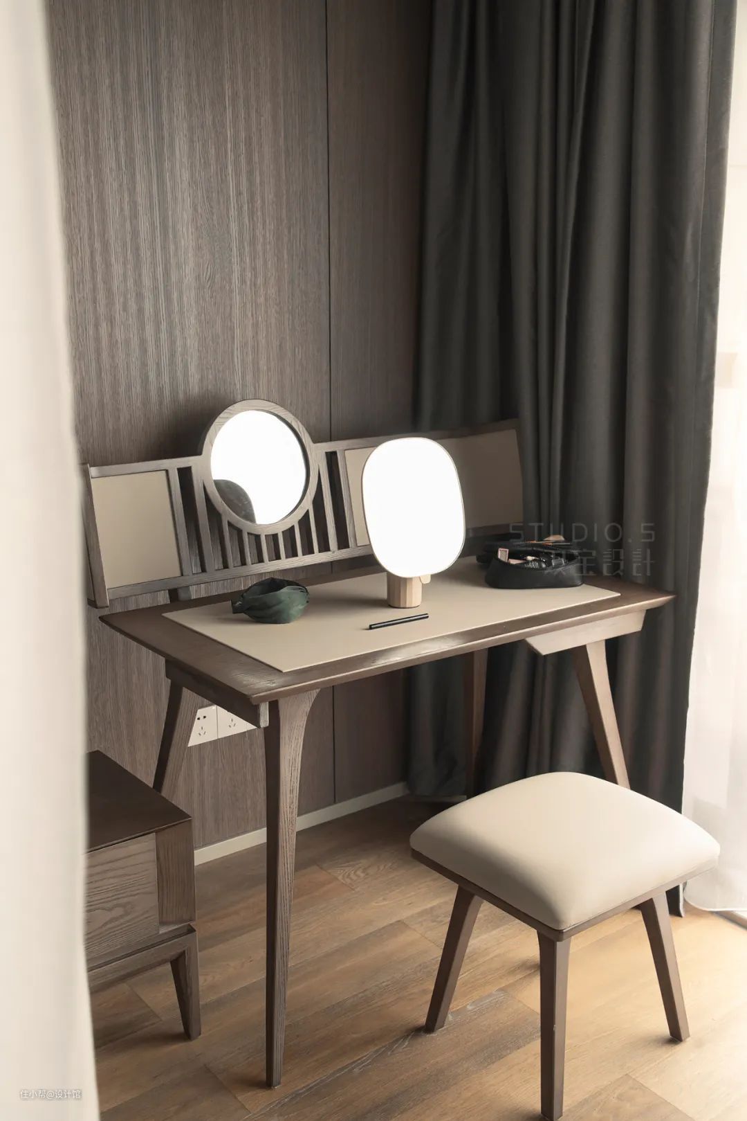 ▲实木材质梳妆台,与木饰面的墙面、木地板保持一致的质感,使得空间充满朴素自然的氛围感。