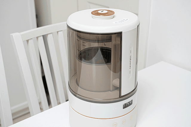 下面我们来看看它的外观吧。一共有两款配色,蓝色和米白。我选择了比较和我环境搭配的米白。整体外形圆润,上部是透明设计,便于观察,下部是触控的操作区。