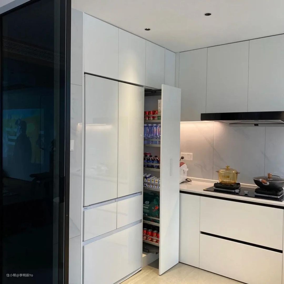 就和传统客厅4件套一样,很多人认为冰箱就该放在厨房。这样放置也符合我们国内一直以来的使用习惯。但从家装的角度来说,这样放置也并不是完美的,从使用体验来说,冰箱在厨房也只能实现食材存储的功能,较单一,但是冰箱的使用不仅是厨房场景,其实日常在客厅、在餐厅也会有高比例的使用需求,所以可把冰箱搬到餐厅或者客厅,实现更多使用场景。