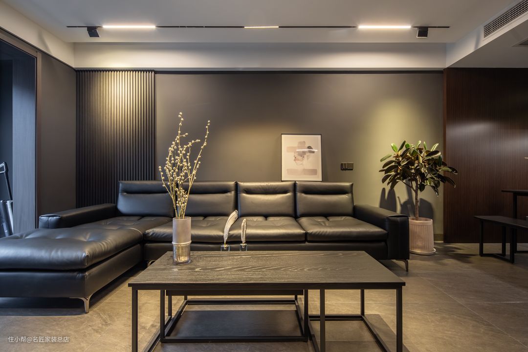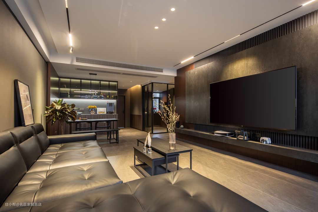 住宅客厅结构周正开阔,客厅选择黑色真皮沙发体现质感,墙面选择岩板以及深灰色墙漆,形成一个无比酷炫的空间环境。