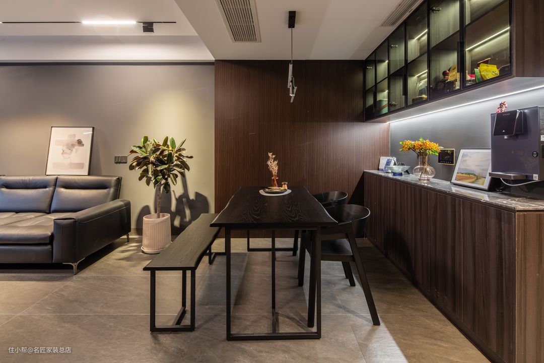 餐厅设计简洁,餐边柜基于功能的考虑,做了透空的设计,以安放直饮机和其它小物品。暗藏灯光带的设计让此处多出些许温柔,橡皮树的一抹新绿给空间增加了勃勃生机。