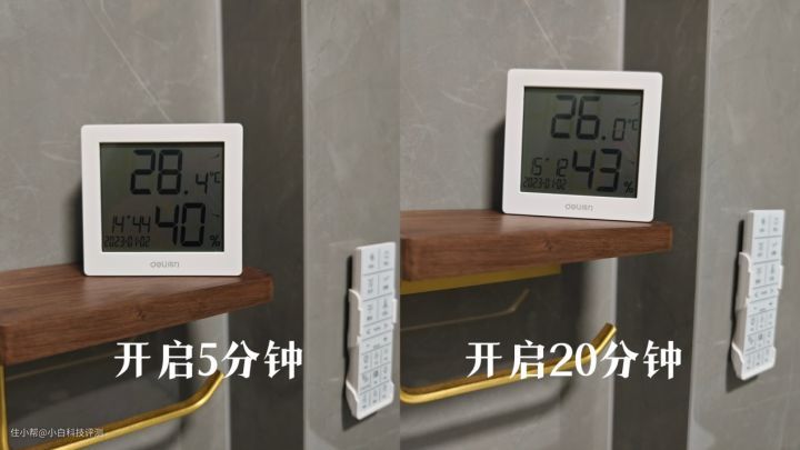 洗澡的时候如果温度不均匀,忽冷忽热就很容易感冒。部分浴霸温度无法控制,更不能在某个温度保持恒定,导致洗澡后半程浴室一直处于高温状态,引发体感不适的同时,加上雾气弥漫,极易产生憋闷窒息感。 对于抵抗力差的老人和小孩来说,更是要选择一款能够保持恒定温度,带来持续舒适暖意的浴霸。 飞利浦P6速热浴霸在这一点上就做得很好,采用陶瓷PTC发热。PTC陶瓷发热片拥有很好的加热效率,可以快速发热,同时也节约了电能。 我在开启后5分钟和开启后20分钟,测试了浴室温度,分别为28.4度和26度,可以看到没有差别,洗澡不会一会儿冷一会儿热,洗起来就很舒服,也不怕感冒。
