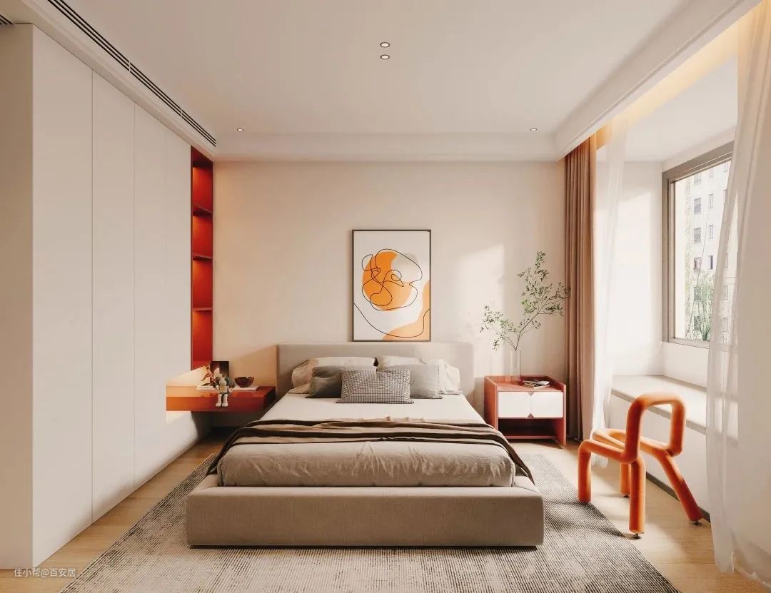爱马仕橙点缀着次卧,凸显独属于年轻人的青春与活力。定制衣柜下方延伸做悬空床头柜,错层设计满足更多收纳需求。阳光透过飘窗倾洒进室内,明暗有度的自然采光让整个房间瞬间充满灵气。