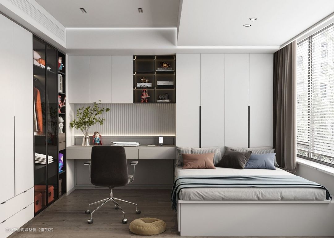 书房与卧室的结合,极大程度的增大了房间的利用率,并且灵活性非常高,体验感愉悦。如果房间稍大,可以将工作区与睡眠区分开。