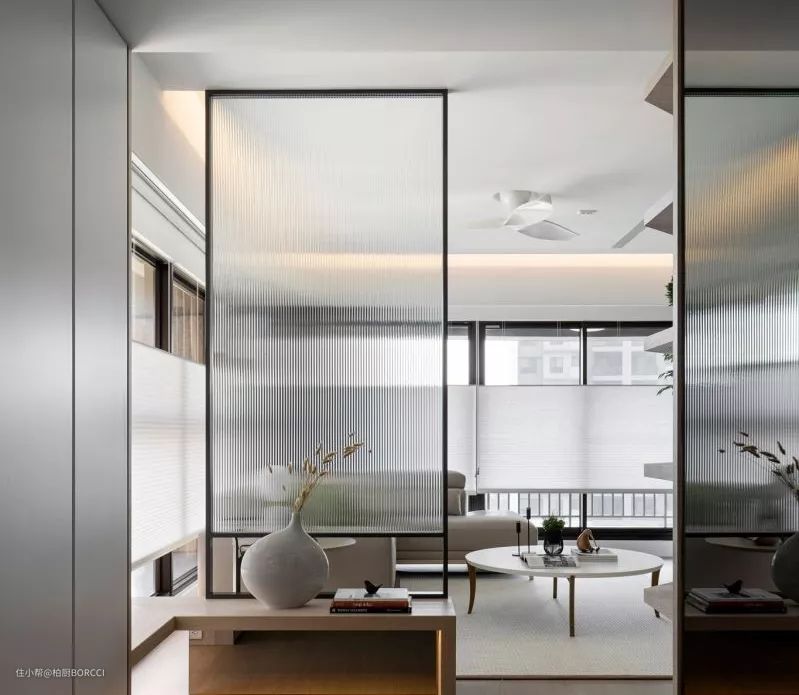 再往里走,玄关处有一个玻璃式样的半扇遮挡,化解了进门见厅的尴尬,也不影响采光。