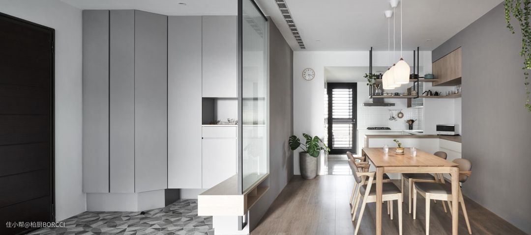 △厨房玻璃推拉门的设置,保证了视觉上的通透,还能巧妙划分空间。