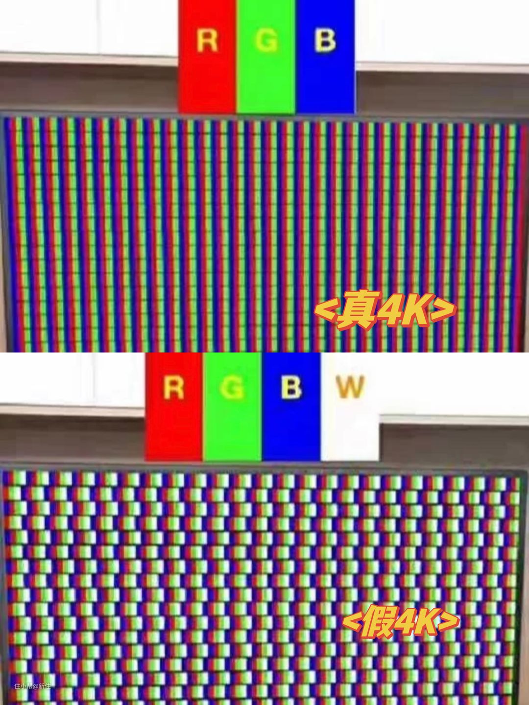 假4K在RGB三原色中加了白色凑点数,识别方法很容易,手机拍照放大,有白色光点的就是假4K。
