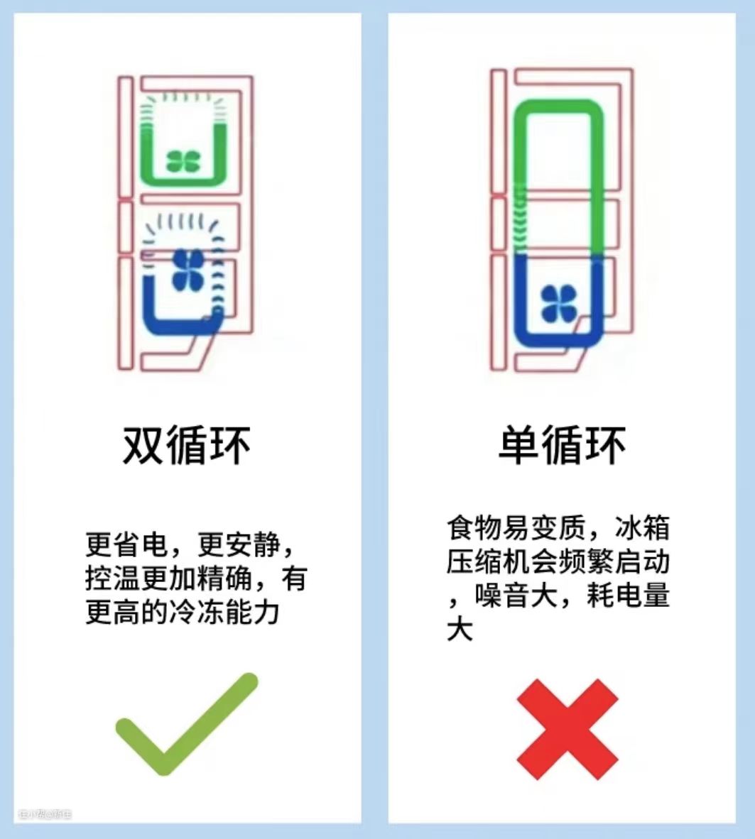 单循环冷藏室和冷冻室共用一个蒸发器,会有窜味现象,控温也不精准,双循环是两个蒸发器,互相不影响。